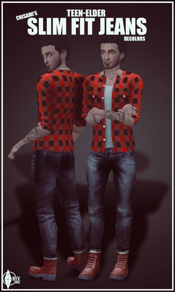 Something a bit different today, I really like Chisami's slim fit jean mesh for men and decided to do some recolors for it. I've included 6 new swatch options that will appear under Chisami's original thumbnail in CAS. You must download her mesh or it will not show up properly in game.